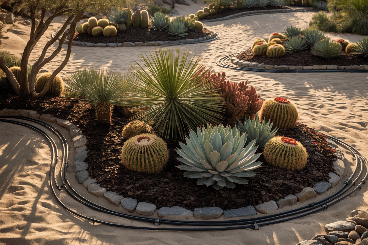 Drip systems, mulching, water harvesting, drought-adaptive planting clusterings.