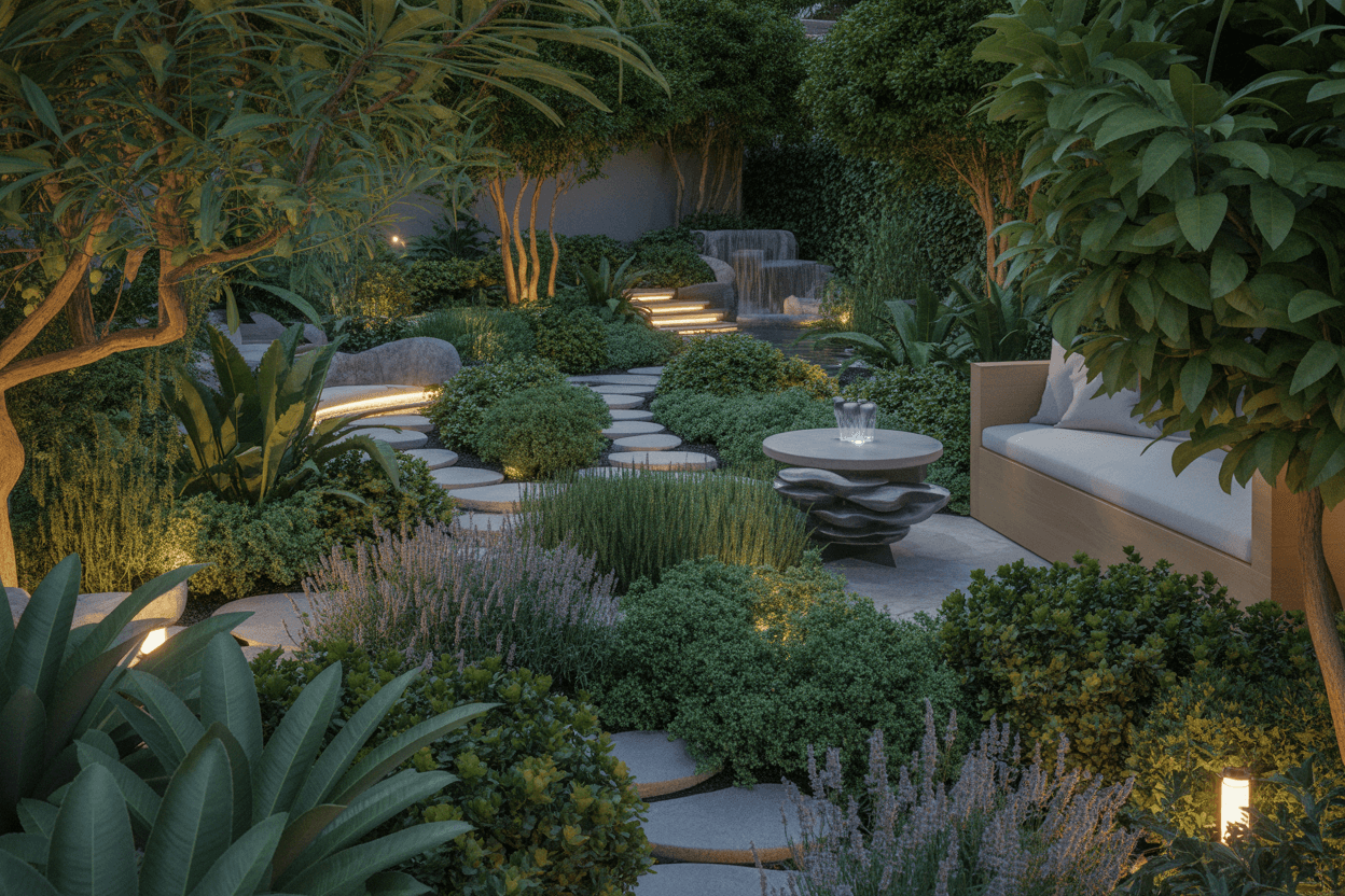 Step-by-step blueprints for garden design, lighting, planting selection; downloadable resources; visual moodboards.