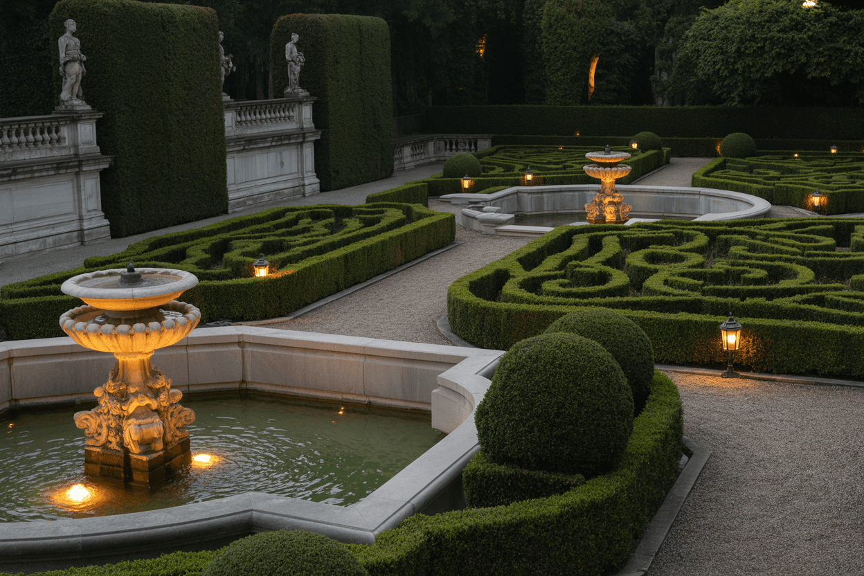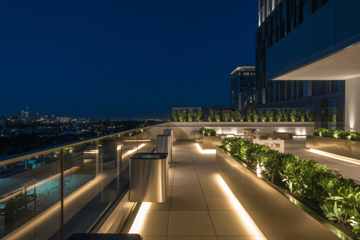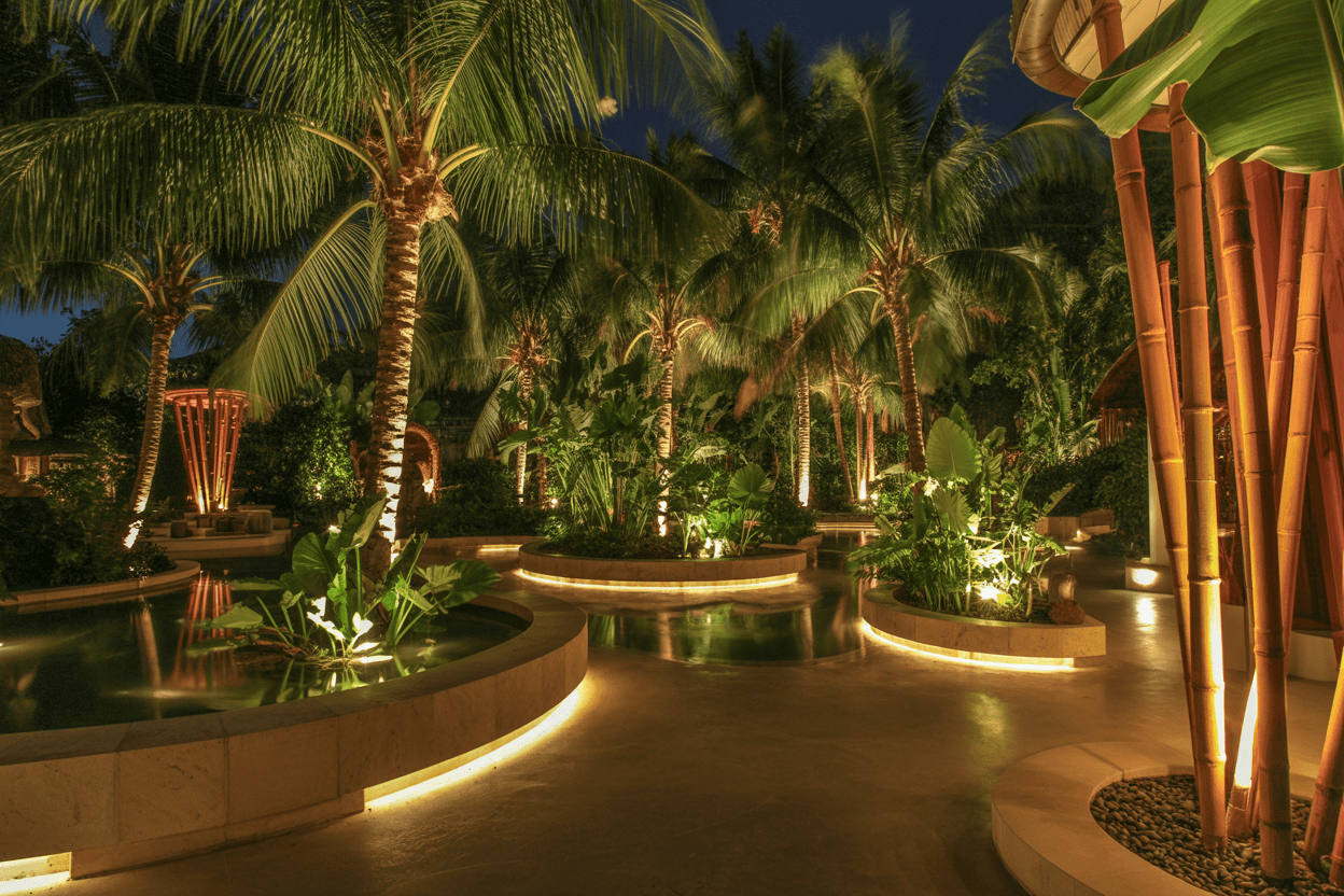 Pool edges, water features, terraces, pathways, feature trees—all styled to give drama and elegance after dusk.