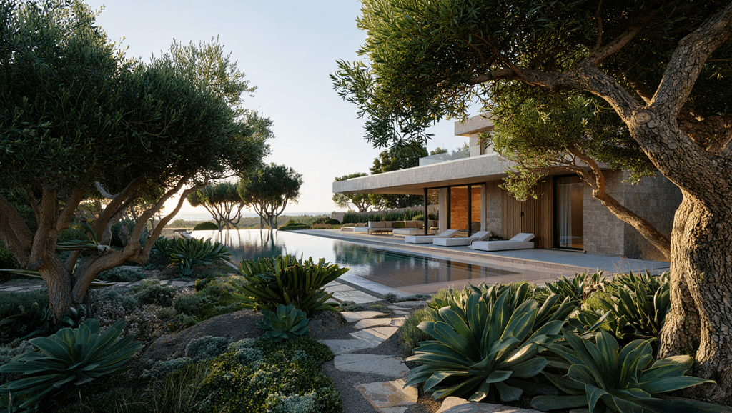 Water Features: Minimalist infinity pools, serene koi ponds, and architectural fountains that cool the air and calm the mind.